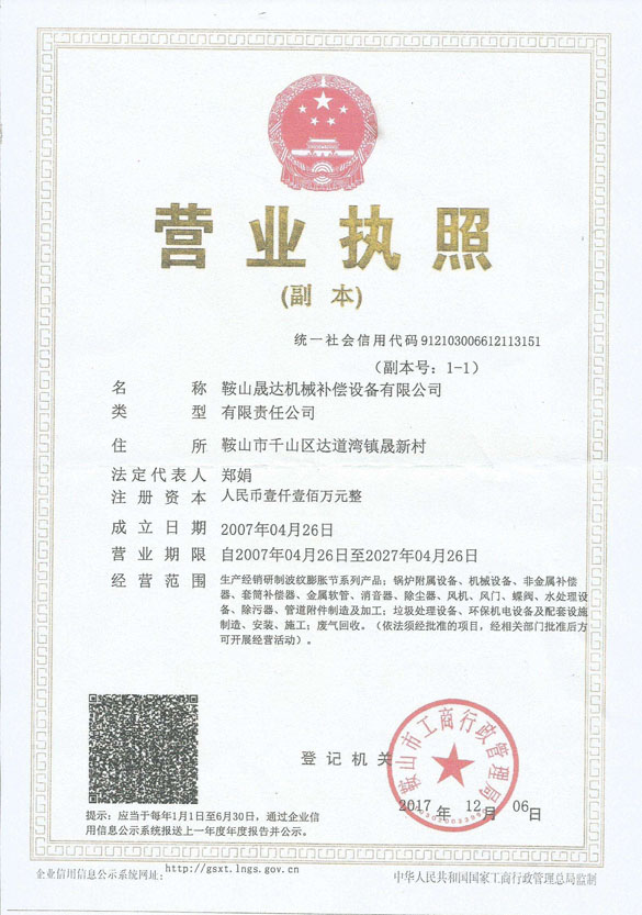 鞍山晟達(dá)機(jī)械補(bǔ)償設(shè)備有限公司成立于2007年4月,是生產(chǎn)、經(jīng)銷、研制波紋膨脹節(jié)系列產(chǎn)品,非金屬補(bǔ)償器,套筒補(bǔ)償器,橡膠接頭,電動擋板閥,卸灰閥,蝶閥,消音器,刮板機(jī),除塵設(shè)備等環(huán)保類設(shè)備的專業(yè)生產(chǎn)廠家。